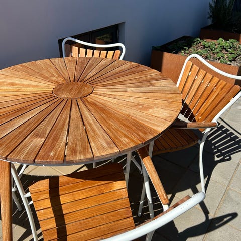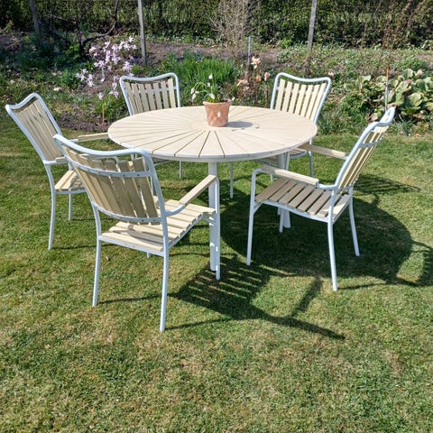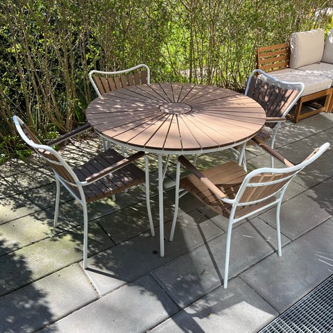 Super fint Kerteminde havemøbelsæt, bord med 4 stole i fin stand, bordet har dog et tryk mærke på top ses på billederne.
