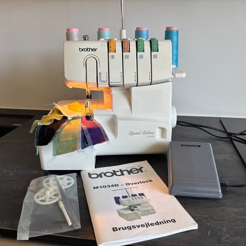 Gritzner 788 overlocker i hvid med farvemarkerede trådspor. Har friarm og justerbare indstillinger på fronten.
