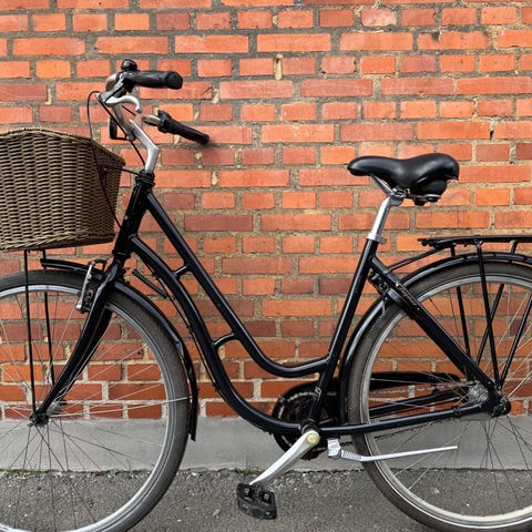 Damecykel - størrelse 51cm - med 7 indvendige gear, 28’’ hjul. Cyklen er sort er med LED-lys samt godkendt lås og har kørt mindre end 500km. Cyklen har både cykelkurv og bagagebærer. Kvittering haves.