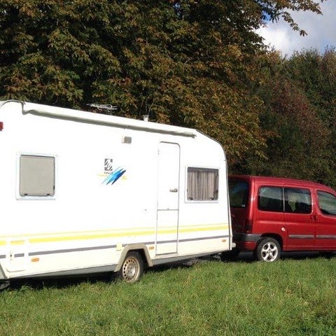 CI Wilk campingvogn med dobbeltseng og køjesenge bagerst. Der er flere vinduer i siderne og skabe i trælook til opbevaring.