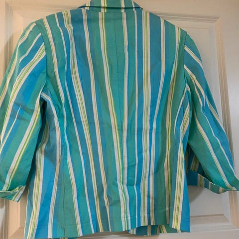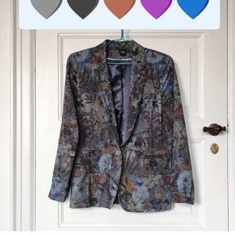 Flot blazer i mønstret stof med pink for. Er syet i Kina efter mål - se billederne. Model syet efter min mors gamle blazer fra 1960'erne.