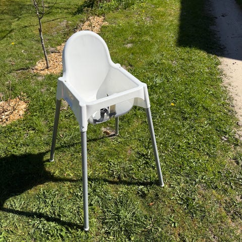 IKEA højstol i hvid med aftagelig bakke. Står stabilt på metalben og er nem at tørre af.