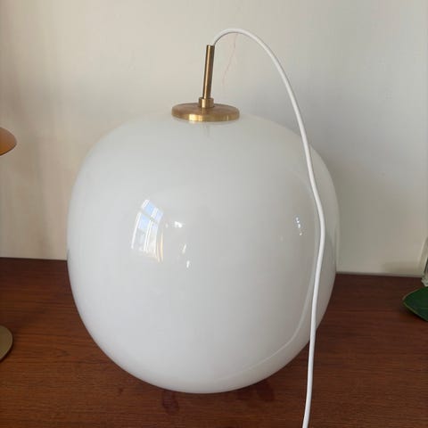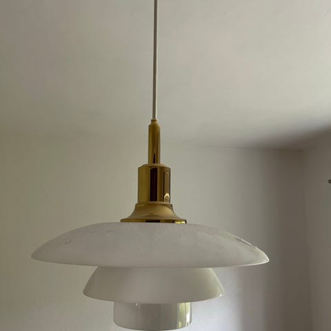 Louis Poulsen 3/2 pendel i hvidt glas med kromfatning. Som ny - ingen skår - kun lidt brugt.