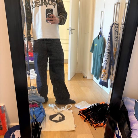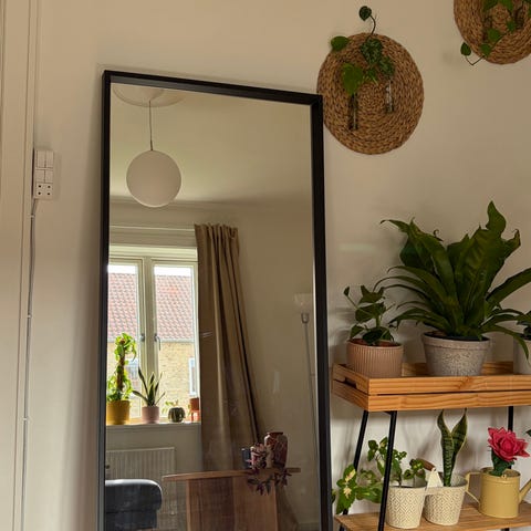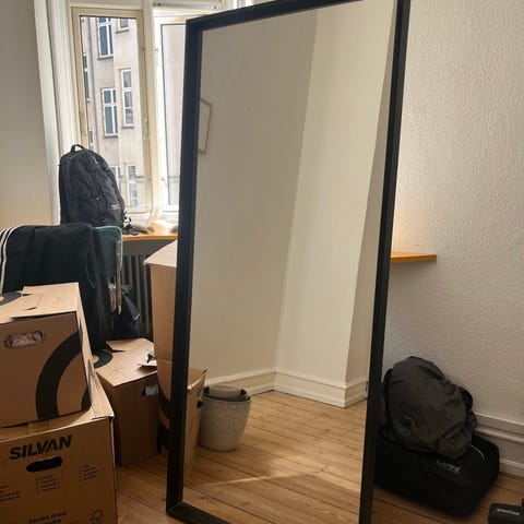 Stort IKEA spejl (helkropsspejl) med bred sort træramme. Den er gået lidt op i hjørnet.
