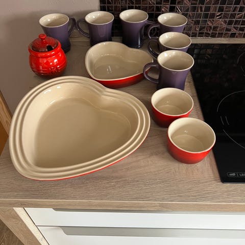 Le Creuset sæt med tre stentøjs espresso kopper i rød og grøn samt en rød hjerteformet sukker skål også i le Creuset.