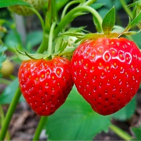 Jordbærplanter af sorten Fragaria Ostara sælges i potter, klar til at blive sat i bed eller krukke. Planterne står i røde plastpotter med jord og har allerede fine grønne blade.