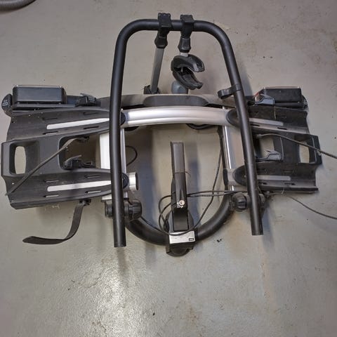 Thule cykelholder til montering på anhængertræk med lås i beslaget. Har baglygter, nummerpladeholder og 13-polet stik samt remme til fastgørelse af cyklerne.