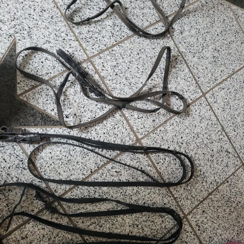 Billede 5+6: Tynde lædertøjler brugte men fungere fint, trænger til at blive pudset - 100kr
