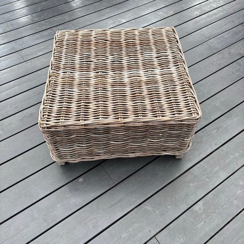 To hvide fletborde i rattan, et sofabord og et mindre sidebord. Begge har hylde under bordpladen til opbevaring af fx bøger eller kurve.