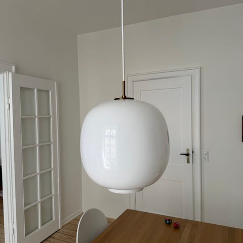Sælger denne flotte Louis Poulsen VL45 Ø370 pendel af Vilhelm Lauritzen i hvidt glas med messingfatning. Lampen står meget flot uden risser eller skar og med flot patina på messingen