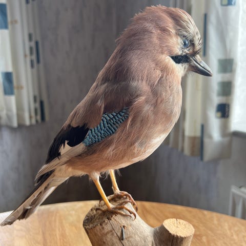 Ubranded udstoppet måge dekoration i naturtro størrelse. Fuglen er monteret på et stykke drivtømmer eller træfod, som giver en stabil base. Fjerdragten fremstår i lyse grå og hvide nuancer med naturtro detaljer. Egnet som dekorativ genstand i hjem, sommerhus eller lignende miljøer, hvor man ønsker et maritimt eller naturinspireret udtryk.