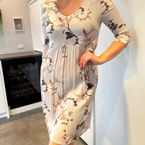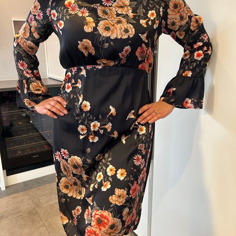 Fest/cocktail kjole fra Frank Lyman i str M, multifarvet med stort blomsterprint og let, løs overdel i polyester. Kjolen har glat, lys underkjole og lynlås i ryggen.