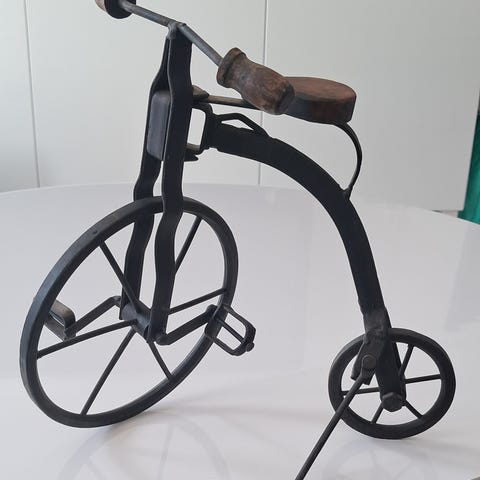2 stk eksklusive retro dekorationscykler i metal med trædetaljer. Håndlavet kvalitet med bevægelig kæde, pedaler og hjul – fungerer som rigtige cykler. Gummihjul, træsæder og mange flotte detaljer. Unik brugskunst til hjem, kontor eller gave. Pris 500 kr pr. stk.