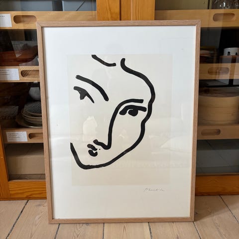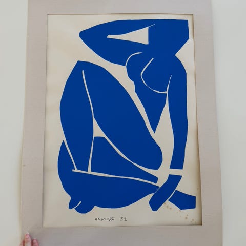 Flot Matisse plakat med blå figur på hvid baggrund. Sidder i ramme og er klar til at hænge op på væggen. Mål med ramme er: højde 120 cm og bredde 90 cm.