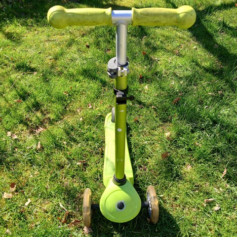 Globber løbehjul med tre hjul i pink og sort, med justerbar styrhøjde. Forhjulene lyser med farvede LED-lys når man kører, og det kan klappes sammen så det fylder mindre.