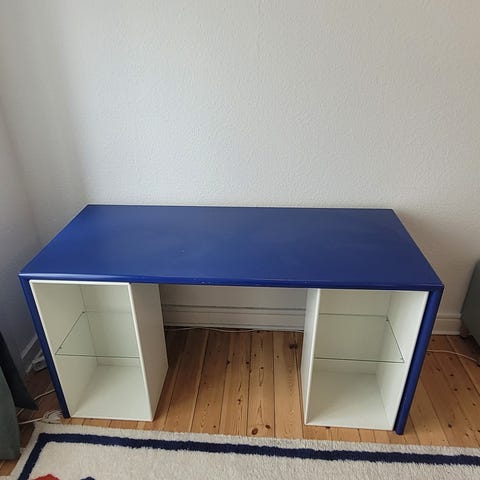 Bygget op omkring to massiv egetræs skabe (det ene er malet grønt indeni og det andet dueblå) bordpladen er massiv fyr der har fræset kanter. Der er stikkontakt under bordpladen til lader osv.