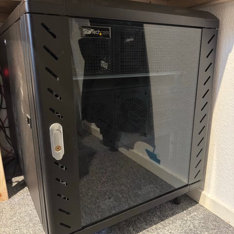 Kraftigt professionelt 19” vægmonteret rackskab i grå. Røgfarvet glaslåge med lås, monteringsskinner, ventilationsforberedelse og patchpanel. Perfekt til netværk, homelab, NAS, switch m.m. Mål ca. 54x40x36 cm. Ny Pris 2.345,- kr.