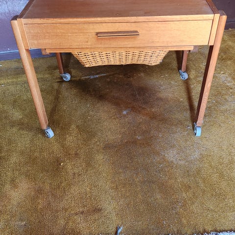 Bordet er i træ med udskæring i bordpladen til symaskine (dog har jeg brugt det til at gemme kabler væk da det blev brugt som hjemme studie).