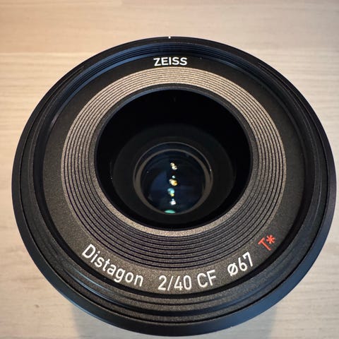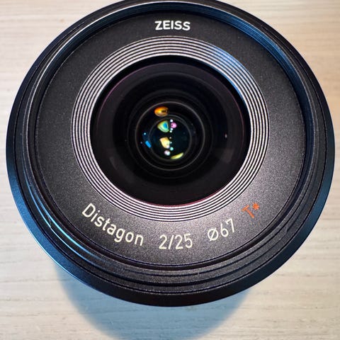 Sony Zeiss Batis 18mm f/2.8 vidvinkel objektiv med fast brændvidde. Har stor frontlinse og elektroniske kontakter til kameraet som ses på billederne.