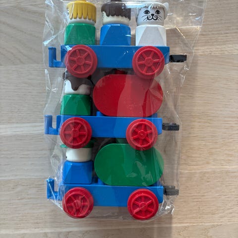 LEGO DUPLO rød cowboyvogn med hest og lille figur. To vogne med hjul, der kan sættes sammen.