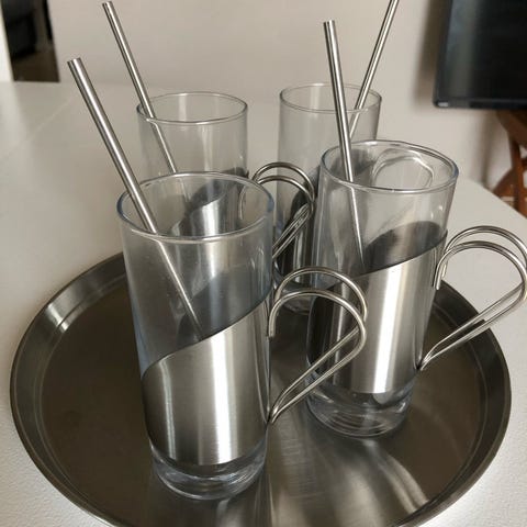 Sæt med 4 høje glas med stålholder og hank. Der følger matchende runde stål-underkopper med til glassene.