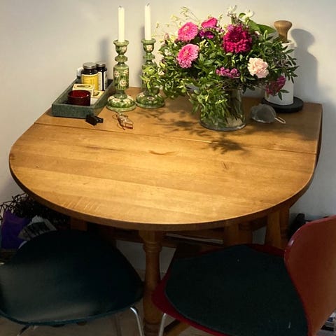 Solid klapbord i sæbebehandlet egetræ til salg. God løsning til små rum.