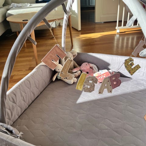 Dette unikke, specielt designede aktivitetsstativ er så æstetisk og praktisk da det kan slåes sammen og stå bag puslebordet fx når det ikke benyttes. Sælges med Filibabba aktivitetslegetøj.