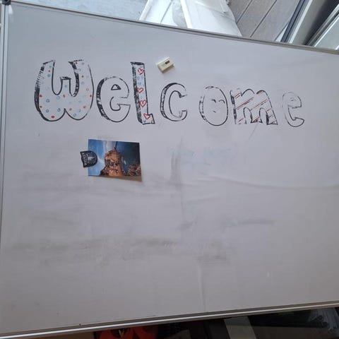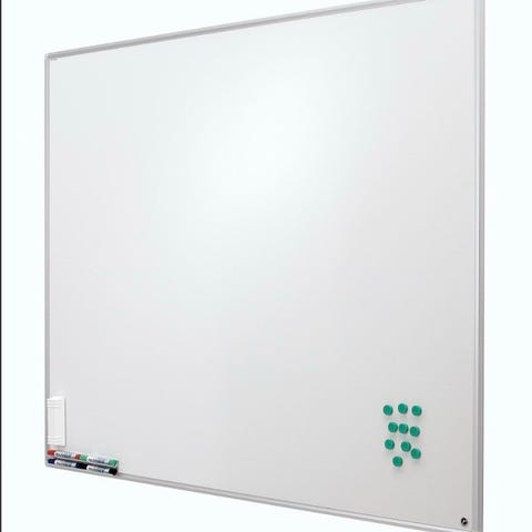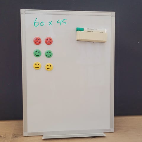 Lille whiteboard på 60 x 45 cm med aluminiumsramme. Der følger nogle smiley-magneter og en tavlevisker med på pladen.