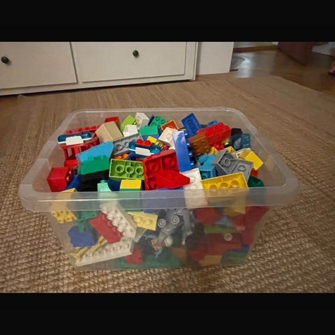 12 kg blandet DUPLO klodser. Der er special ting som piratskib med kanoner, der kan skyde, biler, gravko, gaffeltruck, helikopter, bjerg, der kan bygges på, rutsjebane mv. Her er til mange times leg!