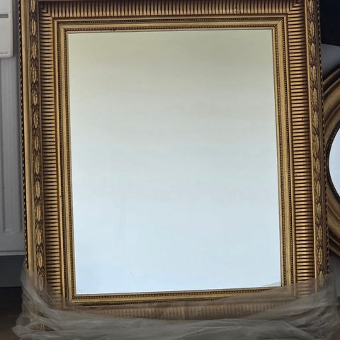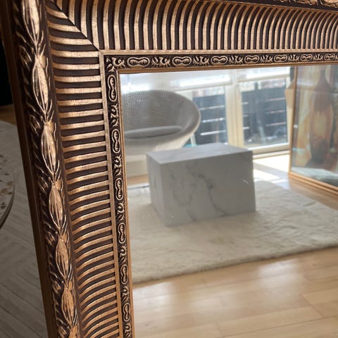 Spejl med “malet messing” kant - stort 176 x 48. Kan hænges lodret og vandret. Rigtig fin stand.