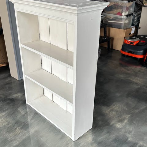 Fin lille bogreol i træ med både åbne hylder og et skab i den ene side. Der er god plads til bøger og nipsting