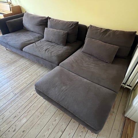Man kan skille sofaen i 2 dele. Puderne følger med. Se mål på det sidste billede.
