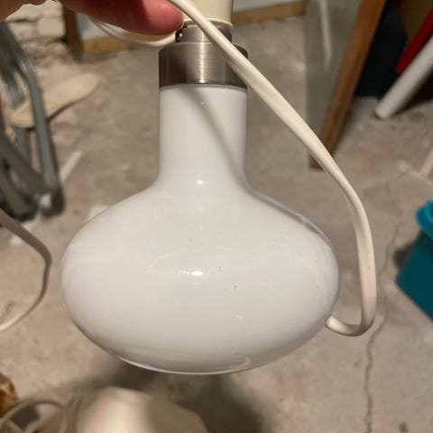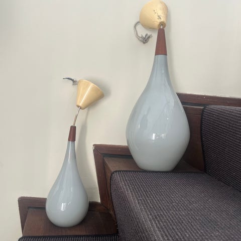 2 fine glaslamper med teakstykke. Michael Bang. Dråben/ teardrop.