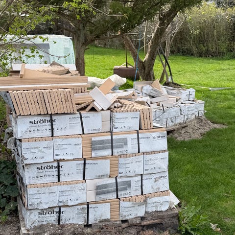 Monier B&C tagsten/tagplader i brun farve sælges samlet. Ligger på paller og i pakker, klar til den næste tagopgave.