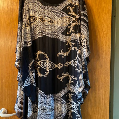 Multifarvet kjole/jumpsuit i str 38 med dyb V-udskæring og løse ærmer. Har knapper i siden og et bånd i taljen med flot mønstret stof. Rigtig flot med en sort stram tynd kjole under den.