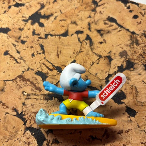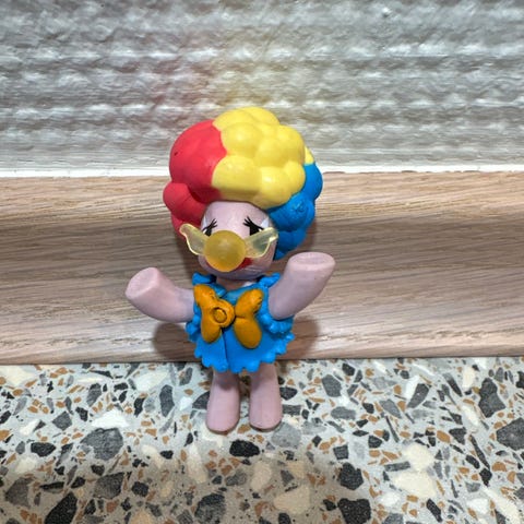 Lille Smølf-figur udklædt som klovn i rød og hvid dragt med blå hoved og stor rød næse. Holder en lille stav i hånden og har fine detaljer foran og bagpå. Fra McDonald’s