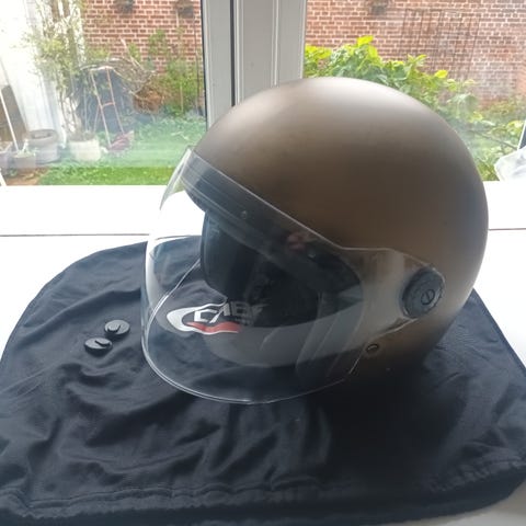 Caberg motorcykelhjelm i skriggul farve med klart visir og indbygget solvisir. Har ventilation foroven og foran samt klik-lukning under hagen. Carberg Duke NIVIZION flip-up styrthjelm med solbrille.
