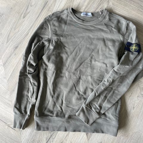 Grå Stone Island sweatshirt i str M i bomuld med logo-badge på ærmet. Klassisk rund hals og ribkanter ved ærmer og talje.