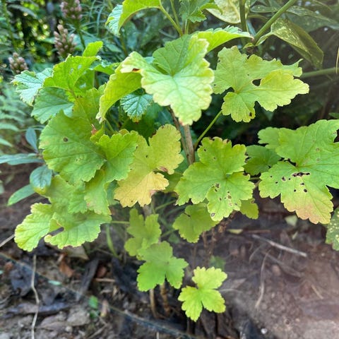 Stikkelsbærbusk med røde bær. Aflæggere fra mine stikkelsbær og enkelte frøsåede.