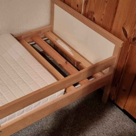 IKEA Sniglar juniorseng i lyst træ, måler ca. 70x160 cm. Har sengehest på siden og en enkel, åben ramme under sengen.