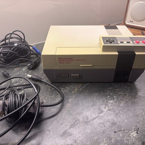 Nintendo 8-bit Entertainment System konsol med klassisk grå/rød front. Har tilslutning til to controllere og frontlåge til spilcartridges.