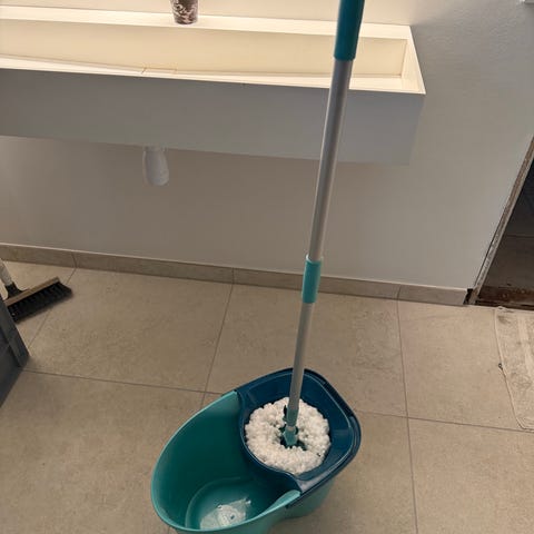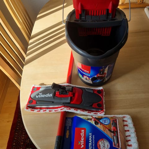 Vileda moppe med spand og vrider til gulvvask. God solid spand med håndtag og klassisk moppehoved på skaft.