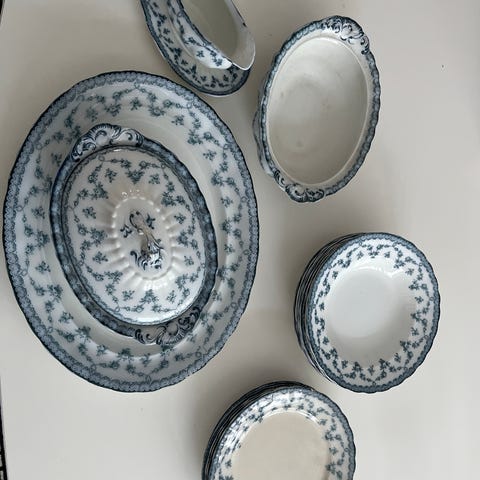2 aflange fade, 1 kantet fad, 1 rundt fad, en kartoffelskål, en sovseskål og salt- og pebersæt