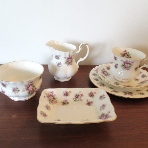 Royal Albert Bone China 1962. Smukt kaffestel til 12 inkl. kaffekande, flødekande og sukkerskål. Middagstallerkner (11 stk.) og frokosttallerkner (12 stk). Fire fade i forskellige størrelser, en kartoffelskål, en sovsekande og et salt- og pebersæt. Alt i nydelig stand. Sælges samlet.