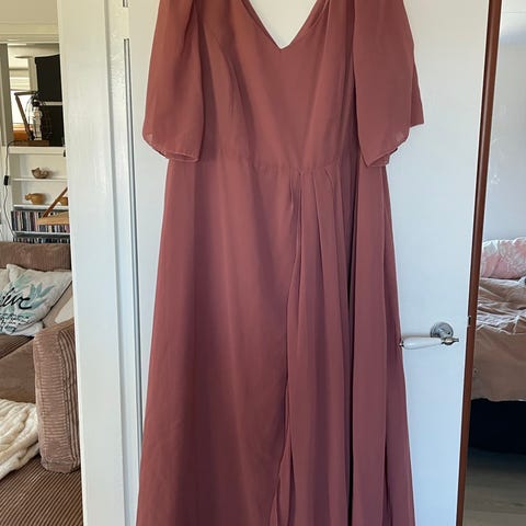 Lyserød Labella kjole fra Gino Cerruti i str 4XL i polyester med slå-om effekt foroven og fine læg i taljen. Kjolen har 3/4-ærmer og lynlås i ryggen.