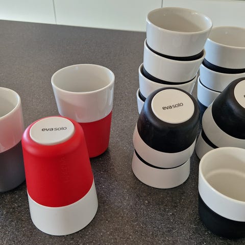 Flotte Eva Solo krus i sort, grå og blå med silikonebånd. Sælges samlet, gode som kaffekrus eller til te.