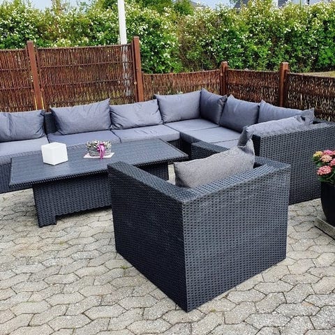 Mørkegrå loungesæt i polyrattan med hjørnesofa og stol