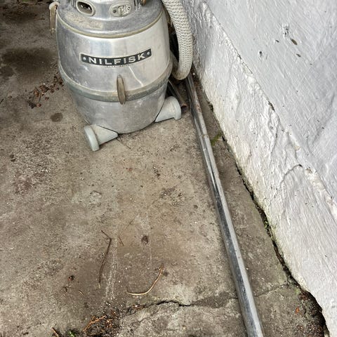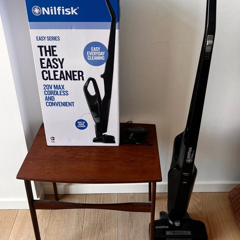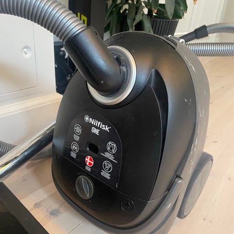 Nilfisk støvsuger i blå med stort håndtag og hjul. Ekstra poser medfølger.