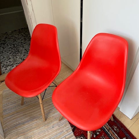 Sælger 4 spisebordsstole i moderne og stilrent design. Stolene har en flot orange skal med integreret sæde og ben i lyst træ.