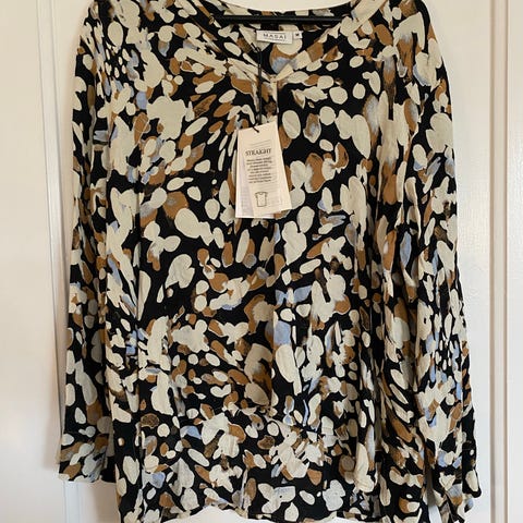 Smuk MUNTHE bluse i varm brun nuance med sort og gyldent blomsterprint. Let viskosekvalitet med fine detaljer som knaplukning i halsen og løse ærmer med manchet. Str. 42/xl. Nypris 1.199 kr.